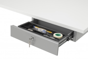 De persoonlijke lade wordt onder het bureau bevestigd en in de lade zit nog een extra pennenbakje.